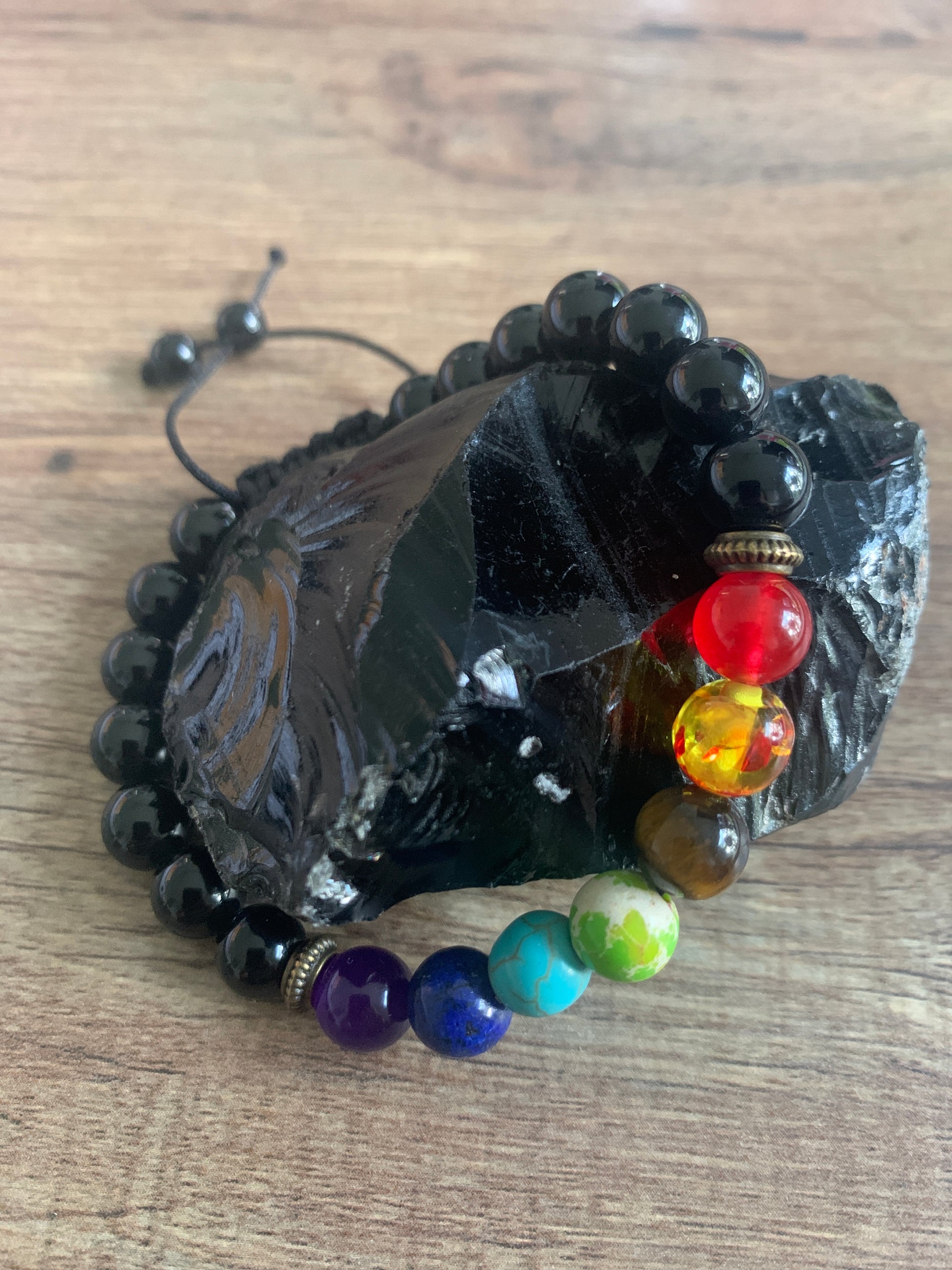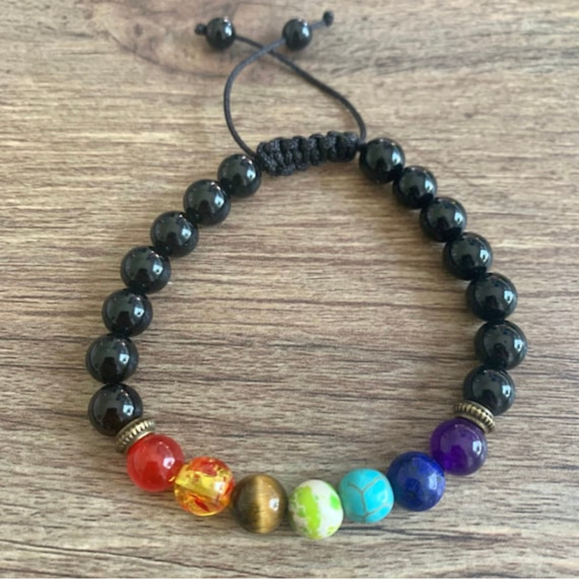 Modern chakra bracelet, made with high quality gemstone beads, each of them represents a different chakra, paired with black agate amplification of the healing energies of each stone, on a adjustable cord.