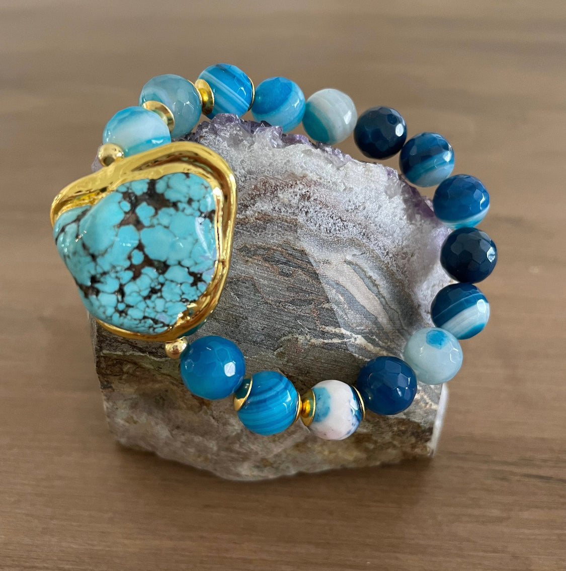 This is a genuine natural Turquoise gemstone beaded bracelet on a sturdy double-threaded stretchy jewelry thread. The bracelet is made with 8mm size beads. A statement bracelet with a gold plated natural rough Turquoise gemstone approximately (1 - 1.5 inch).